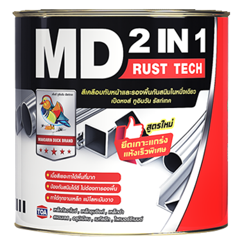 สีเคลือบทับหน้าและรองพื้นกันสนิม MD 2 IN 1 RUST TECH มาพร้อมกับคุณสมบัติที่สามารถปกป้องพื้นผิวจากสนิมได้โดยไม่ต้องทารองพื้น แห้งเร็ว และสามารถยึดเกาะบนพื้นผิวโลหะมันวาวได้อย่างดีเยี่ยม นอกจากนั้นยังสามารถทนต่อสภาพอากาศ และการกัดกร่อนได้เป็นอย่างดี แถมยังทนทานต่อการขูดขีดอีกด้วย